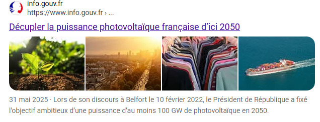 -L'installation de panneaux photovoltaïques progresse rapidement en France sans agrivoltaïsme à un rythme d'environ 5 GW par an (A ce rythme on aura atteint sans agrivoltaïsme l'objectif de 75 GW d'installations supplémentaires en 2050).