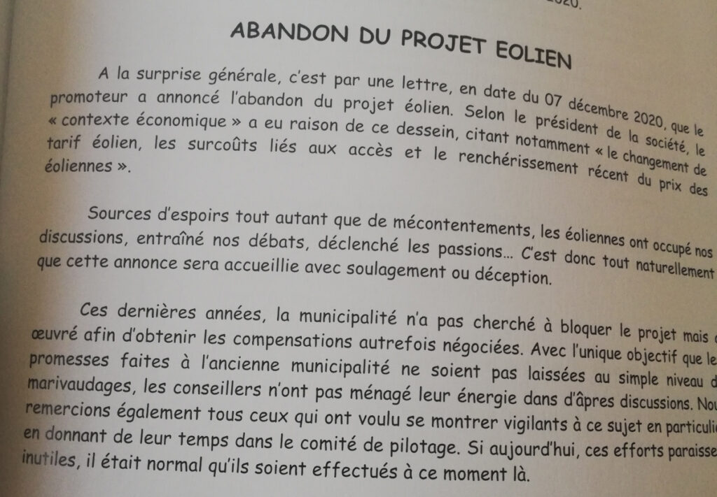 La première c’est qu’une des trois communes aurait été trop longue dans les négociation de la taxe foncière que l’entreprise devait s’engager à leur verser tout les ans. Cette taxe foncière est pourtant réglementée 24 000 euros/éolienne de 2MW, répartie entre la région : 6 %, le département : 30 %, la communauté de communes : 60 % et la commune : 3,8 %. Les deux autres communes avaient dit amen. Et que du coup aujourd’hui le prix de rachat de l’électricité par l’État aurait baissé.